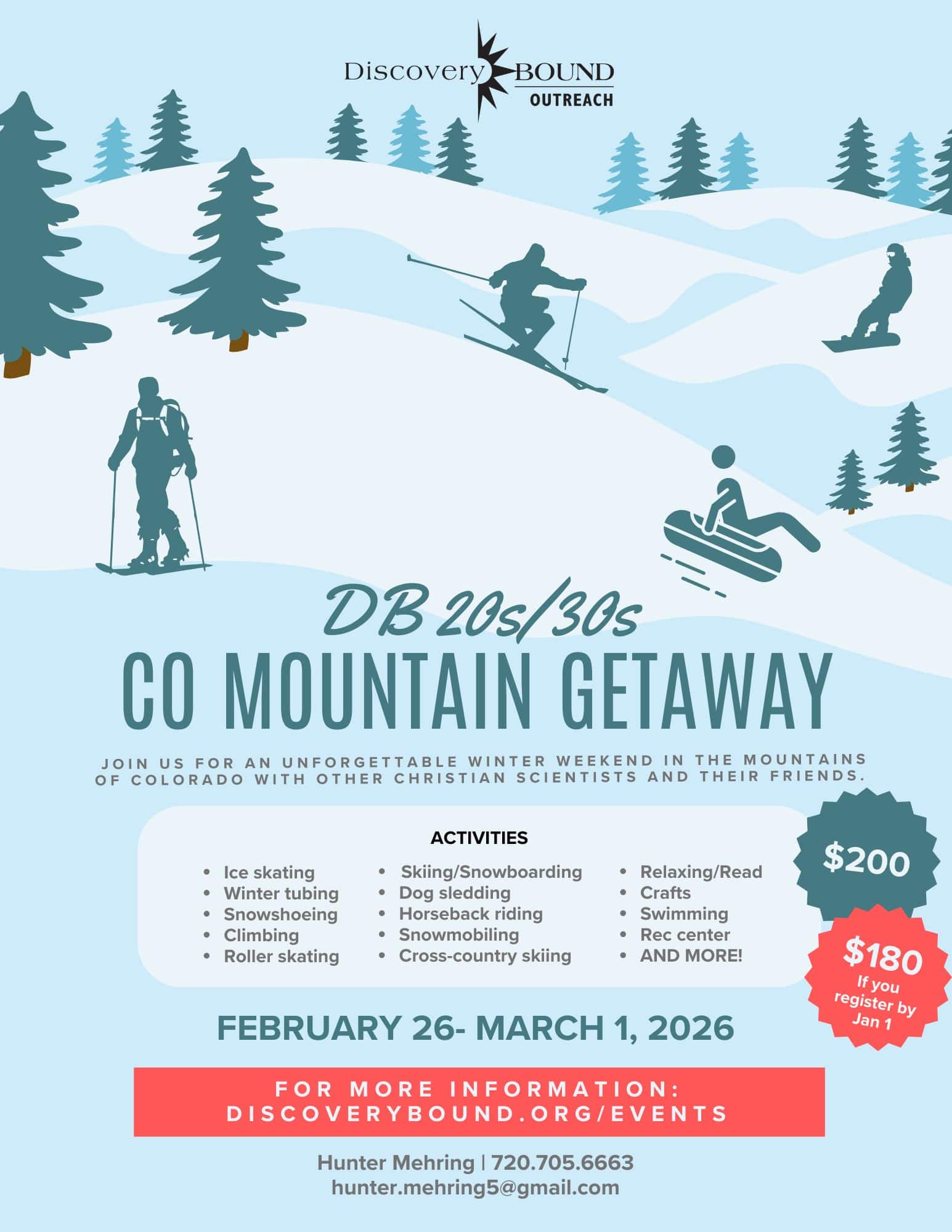 Event Description: Come join us for an unforgettable weekend in the mountains of Colorado with other Christian Scientists and their friends. Enjoy skiing or snowboarding at Winter Park Resort, tubing, games, a metaphysical discussion, and plenty more fun winter activities. If skiing or snowboarding isn’t your thing, there are still lots of great ways to enjoy this snowy getaway. We hope you can make it!