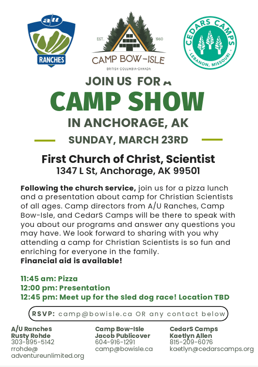 Join camp directors from all three camps for lunch and to learn about youth, family, and adult programs available year-round at the A/U Ranches in Buena Vista, Colorado, Camp Bow-Isle on Bowen Island, British Columbia, and Cedars Camps in Lebanon, Missouri.