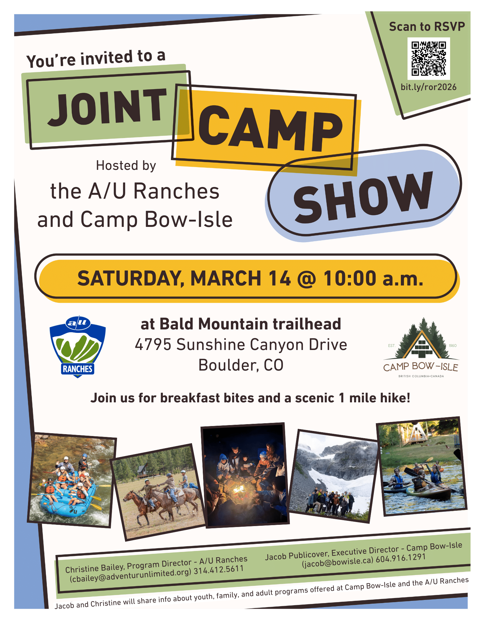 Join Christine Bailey from the A/U Ranches and Jacob Publicover from Camp Bow-Isle for breakfast bites and a scenic one mile hike up Bald Mountain. You’ll also learn about youth, family, and adult programs available year-round at the A/U Ranches in Buena Vista, Colorado and Camp Bow-Isle on Bowen Island, British Columbia.