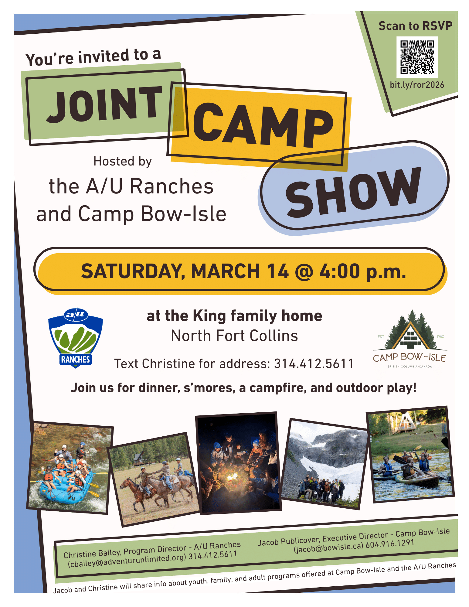 Come connect with camp! We’re headed to Fort Collins for a joint camp show with Camp Bow-Isle.
