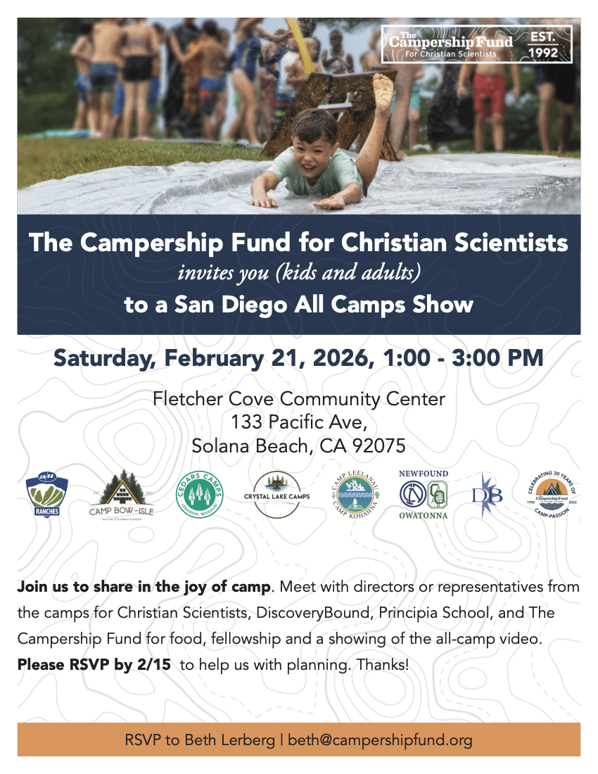 Join us to share in the joy of camp. Meet with representatives from the camps for Christian Scientists, DiscoveryBound, Principia School, and the Campership Fund for food, fellowship, and a presentation about programs offered through all these organizations!