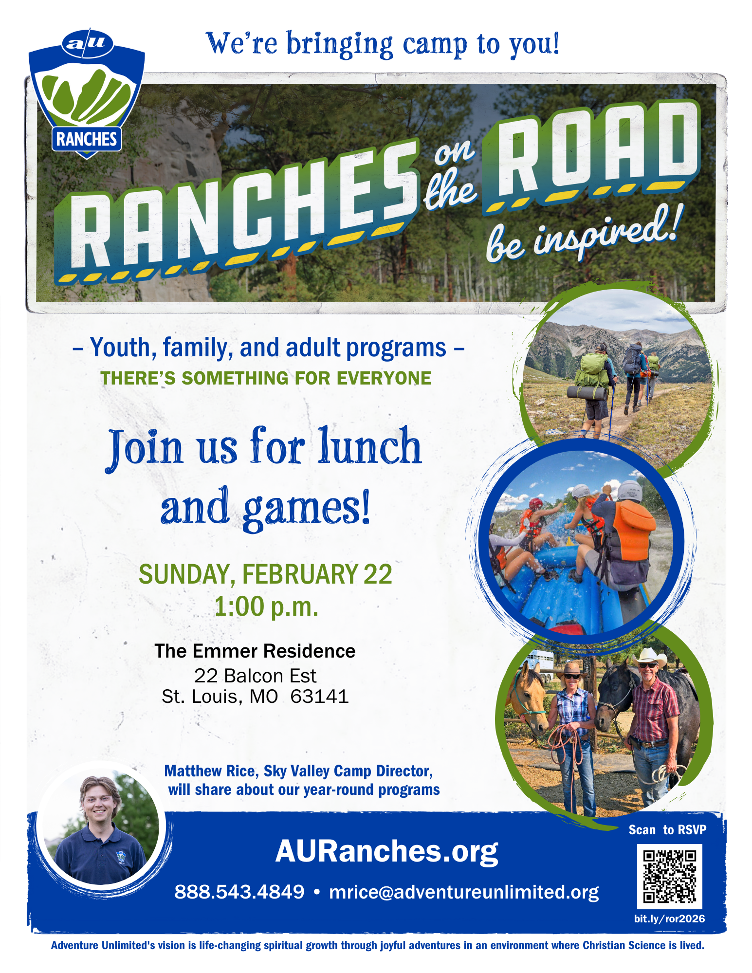 Connect with camp by joining us for an A/U Ranches on the Road camp show! We’re headed to St. Louis! Join Sky Valley camp director Matthew Rice to learn more about programs for all ages. Play camp games, connect with others, and join us for lunch!